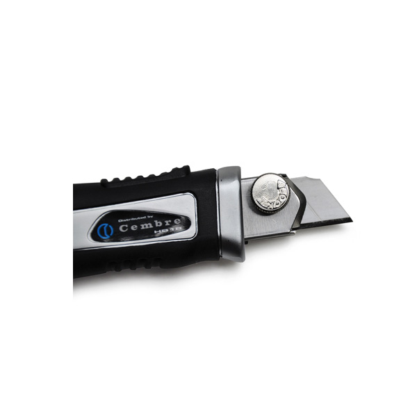 Cúter con hoja reemplazable de 18 mm fraccionable y cargador automático interno con 5 hojas.Vía de la hoja en acero, empuñadura en metal, con recubrimiento en suave goma antideslizante.Bloqueo de seguridad para la hoja